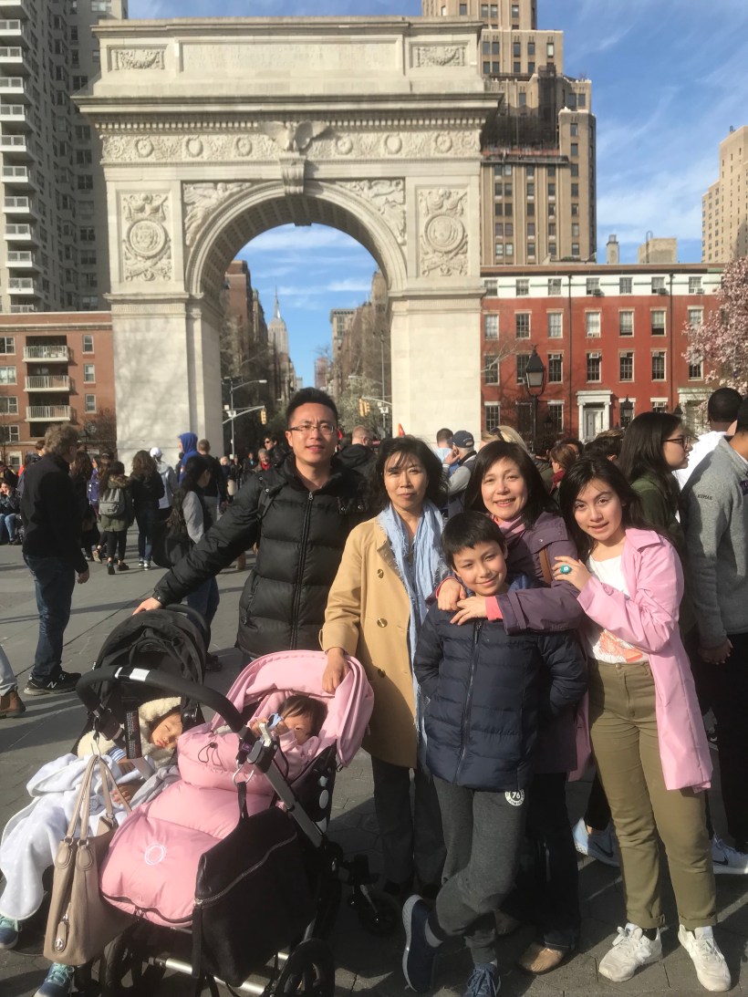 吃完飯,我們一路散步到華盛頓廣場,跟著名的景點-小凱旋門拍照,Chelsea 跟 Florence 姐妹倆累了在嬰兒車裡休息睡覺。