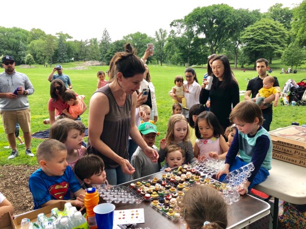 Chelsea 的同學下午在公園裡的一塊草地上辦生日派對,小朋友們開心地在草地上玩,排隊等著領小杯子蛋糕。