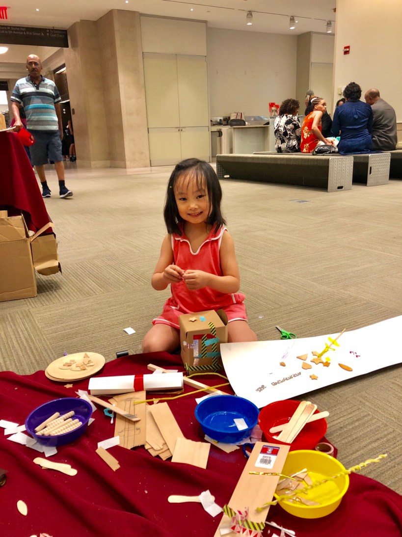 週日,大都會博物館舉辦家庭日,讓家長帶著小朋友做勞作,Chelsea 也來參加創作,很專心地佈置裝飾自己的紙盒。
