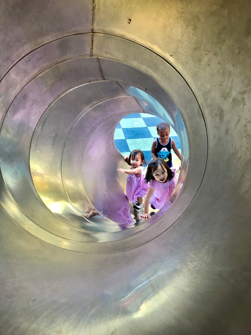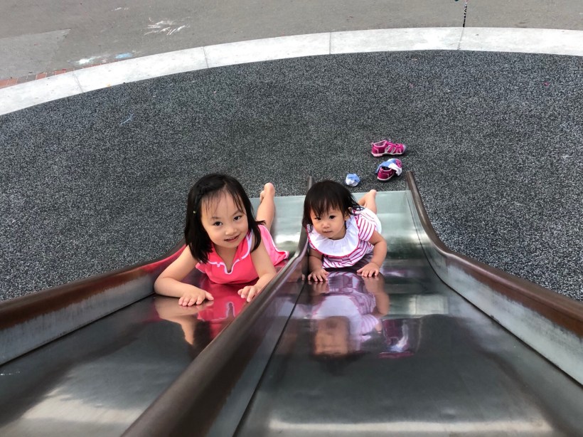 逛了一會,姐妹倆決定先到公園裡的兒童遊戲場玩,Chelsea 帶著 Florence 坐旋轉滑梯,兩人玩得相當開心盡興。