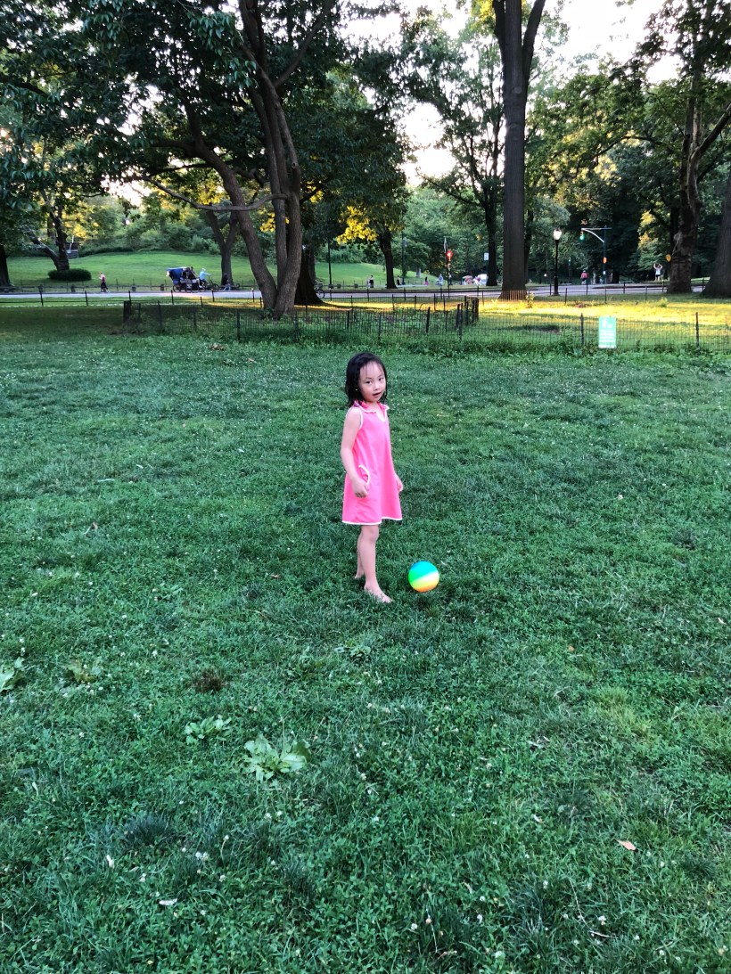 Chelsea 也喜歡在旁邊的大草地上踢球,在世界盃的薰染下,在學校有學習足球初級技巧的 Chelsea,有模有樣地踢球、表演。