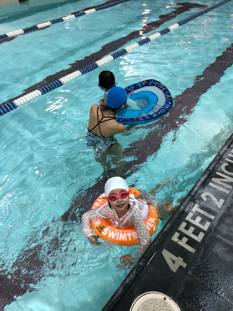 Florence 享受地在浮圈裡漂浮,仔細地觀察著姐姐學游泳。