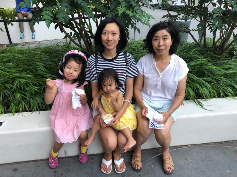 古根漢美術館這週的夏日特別活動是免費吃冰淇淋,姐妹倆吃完晚餐,趕緊來參加,兩人一口接一口吃得津津有味。