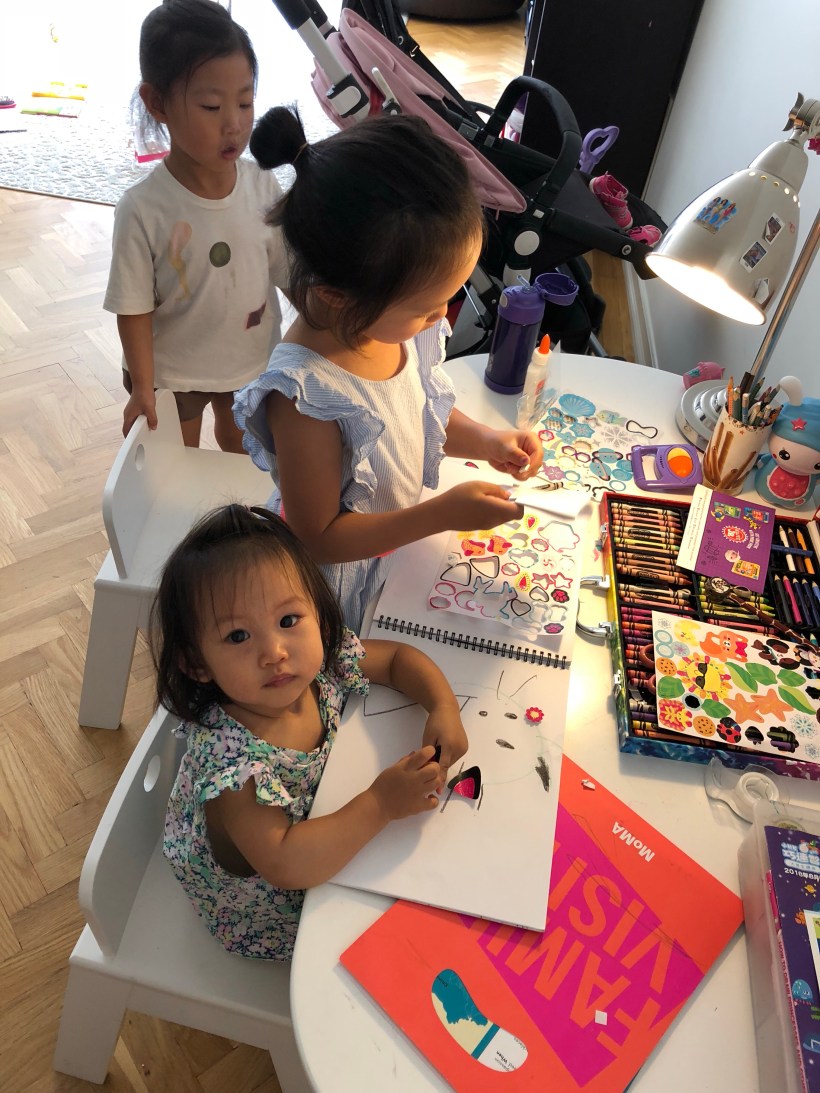 這禮拜,Chloe 的爸爸媽媽帶著她從香港來找我們玩,Chelsea 跟 Florence 很喜歡跟 Chloe ㄧ起玩鬧,這天三個人一起認真地做勞作。