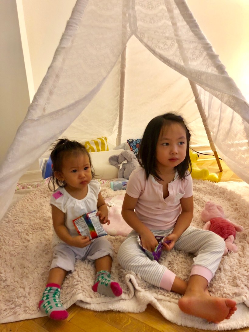 週日晚上,我們也幫 Chelsea 跟 Florence 姐妹倆在家裡舉辦露營電影會,兩人在小帳篷裡,吃著點心,目不轉睛地看投影的卡通。