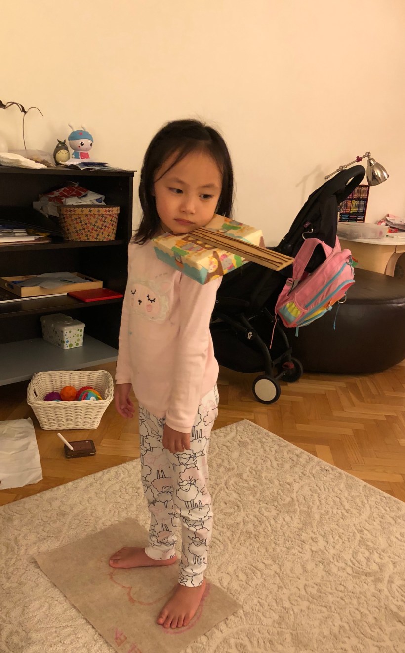 Chelsea 的小提琴課,本週的作業是習慣拉奏小提琴的姿勢,要先從紙箱開始練習,Chelsea 在家裡專心地在學習。
