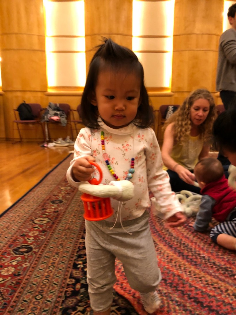 這週末,Florence 一早又跟著 Chelsea 去上小提琴課,正巧音樂學校裡的另一個教室在上寶寶音樂課,因爲人數不夠,邀請 Florence 來試上,一歲五個月大的 Florence 是班上的小姐姐,好奇地跟著老師嘗試各種小樂器。