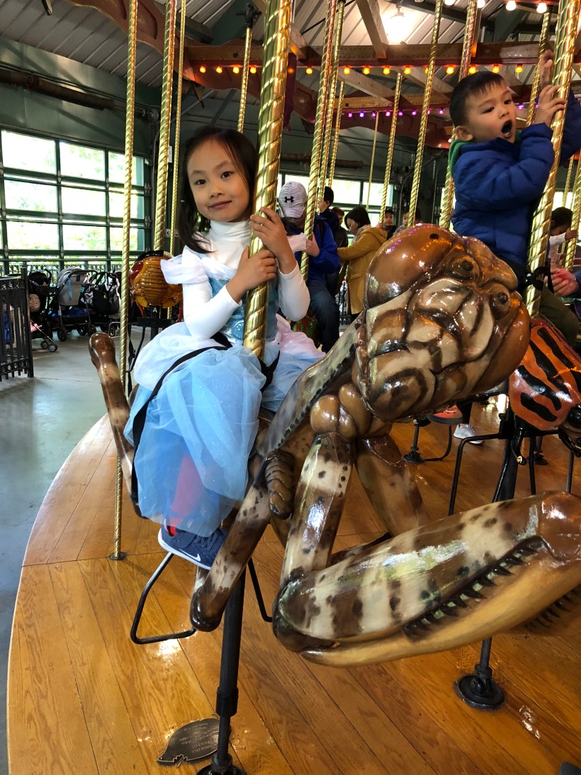 臨走前,Chelsea 當然得坐最喜歡的旋轉木馬才肯離開,這次挑的是一隻螳螂,旋轉木馬的音樂也配合萬聖節主題播放恐怖音樂,歡樂又詭異的氣氛,Chelsea 覺得很新奇有趣。
