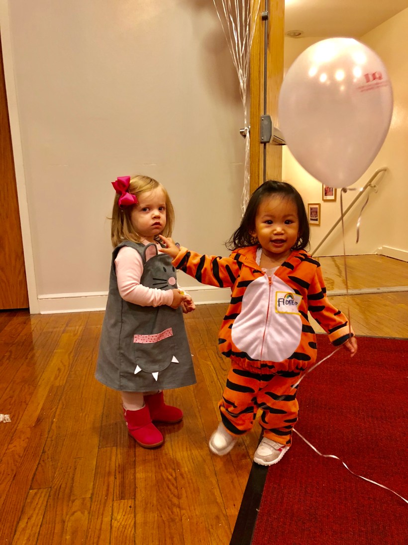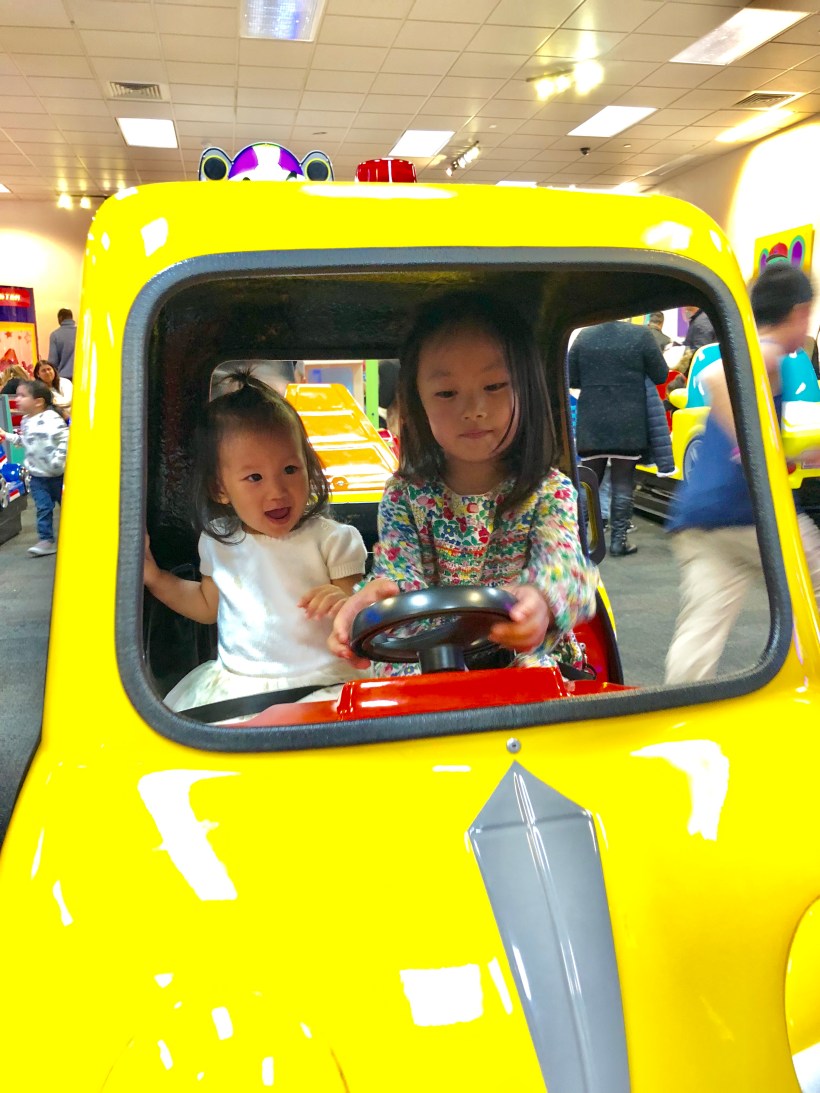 這陣子,姐妹倆可是過足了變裝的癮。沒有參加活動的時候,這天我們經過一個在 Flushing 商場裡的兒童遊樂中心,有各式各樣的小遊戲機台,讓小朋友們集點數換禮物,Chelsea 跟 Florence 玩得欲罷不能。