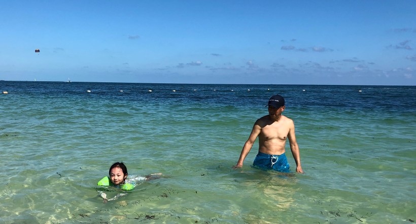 Chelsea 喜歡跟著姥爺在海裡游泳,在溫暖的海水裡,自己能夠自在地帶著浮圈游泳,是這趟旅行中最大的收穫。