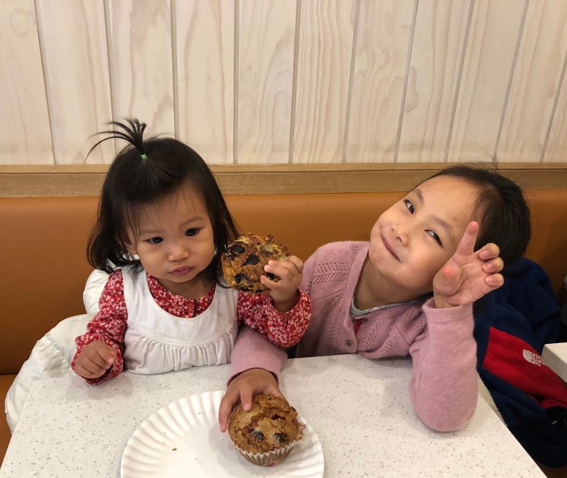 Chelsea 小提琴課中間休息,帶著 Florence 一起到街口的咖啡店吃點心。姐妹倆很開心地吃吃喝喝、玩鬧。