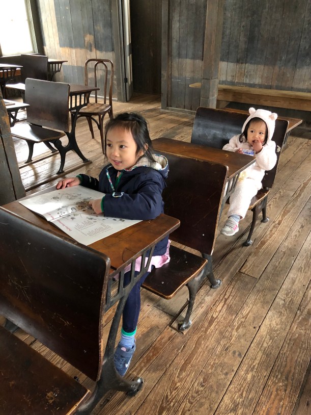 我們也來參觀達拉斯的老城區,了解城市的歷史發展與古蹟,Chelsea 跟 Florence 到保存的老教室參觀,Chelsea 有模有樣地看著書,Florence 則頑皮地顧著吃點心。