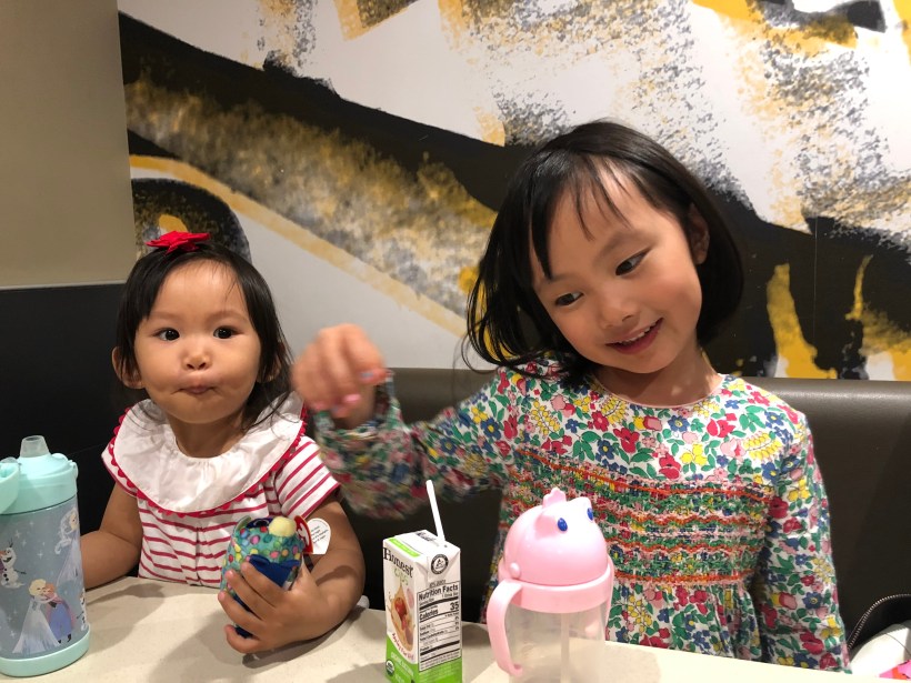 姐妹倆盡情地玩了一下午,晚餐到麥當勞吃快樂兒童餐,開心地把玩著餐點附贈的禮物。