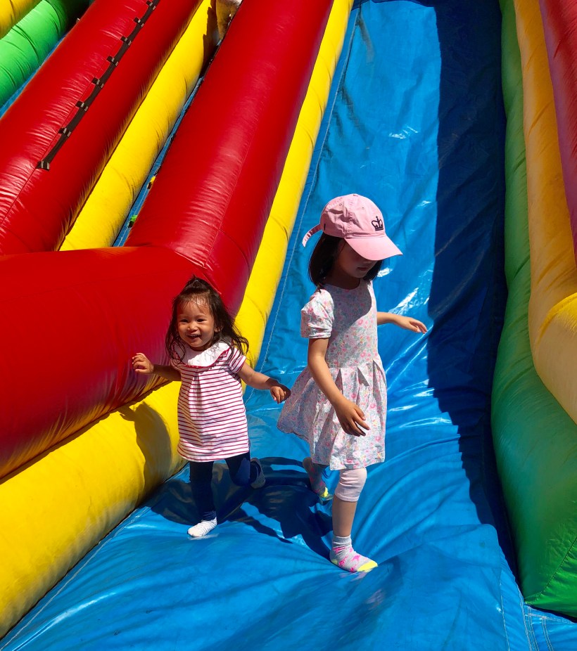 姐妹倆迫不急待地要玩充氣大滑梯,儘管需要花點力氣爬充氣樓梯,Chelsea 與 Florence 三兩下就上了滑梯溜了下來。