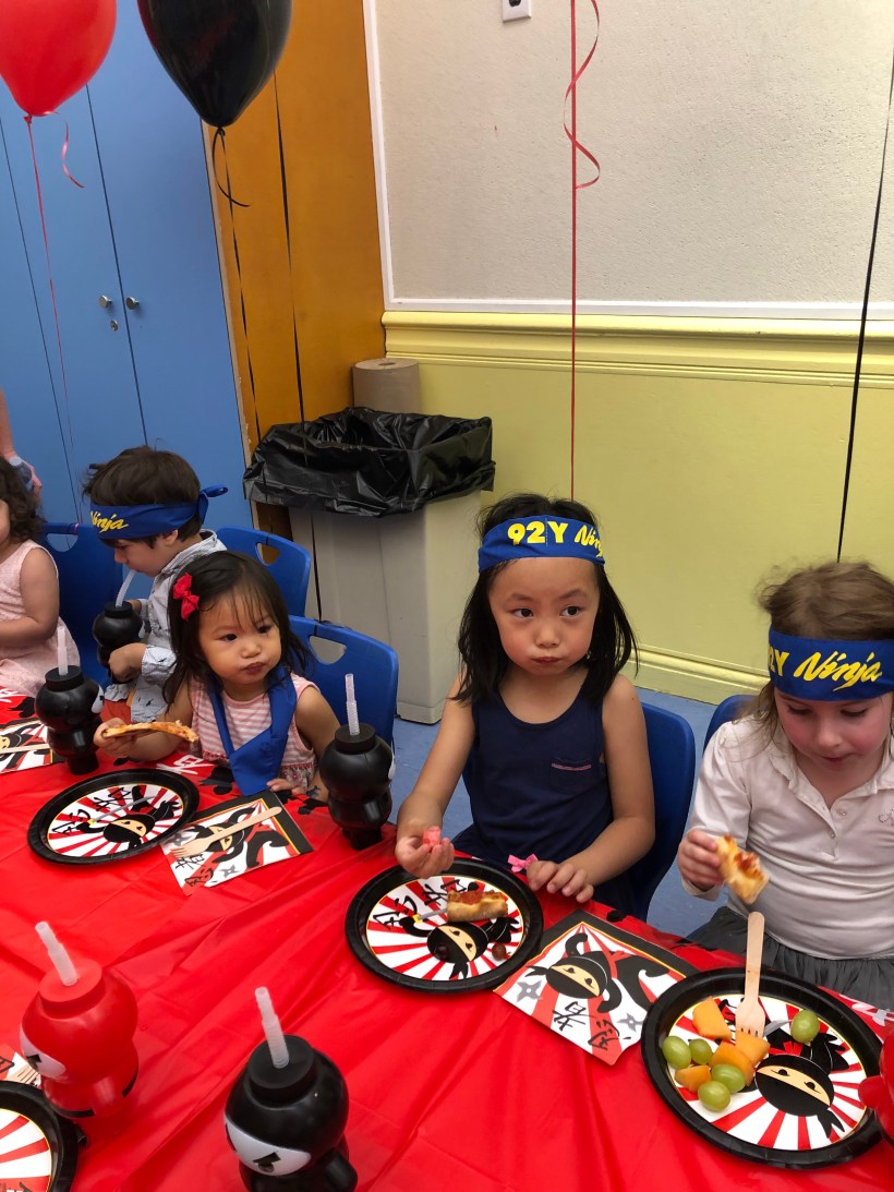 這週末,Chelsea 先參加了兩場同學的生日派對,Florence 也跟著一起來見見世面。第一場生日派對在上東區一間兒童活動中心舉辦,主題是忍者派對,大夥用著忍者的餐具、水壺,覺得新奇有趣。