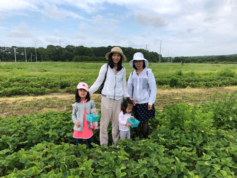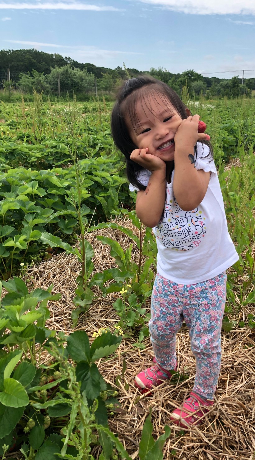 週日,趁著多雲不炎熱的天氣,我們到長島的郊區採草莓,Chelsea 與 Florence 一到草莓園,迫不及待地鑽進草莓樹叢裡採收草莓。