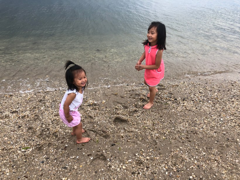 姐妹倆早已按耐不住要下水玩,由於海水清澈,可以看見許多小魚成群的游泳,兩人邊玩邊好奇地觀察海邊的小生物。