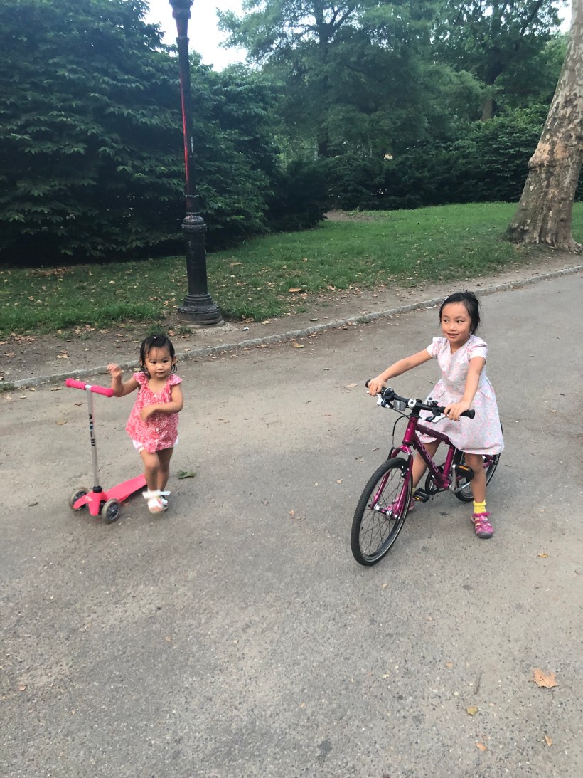 傍晚,天氣較涼爽,姐妹倆迫不及待地分別騎上腳踏車跟滑板車到中央公園裡玩,一路騎到公園南面的兒童遊戲區,逛了一大圈後,經過冰淇淋店,吃了球冰淇淋後,滿足地回家。