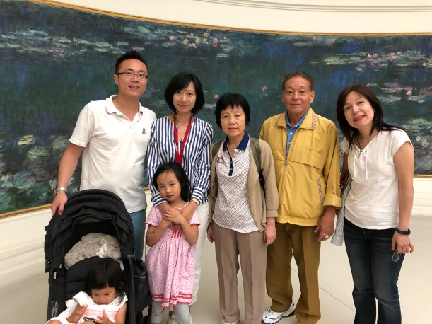 八月中旬,我們約了阿公、阿嬤一起到法國找阿姑一家玩,第一站抵達阿姑在巴黎的家,一放下行李,Chelsea 迫不及待地要到橘園美術館欣賞莫內的畫作,館藏 360度的四季荷花池是莫內最有名的作品之一。