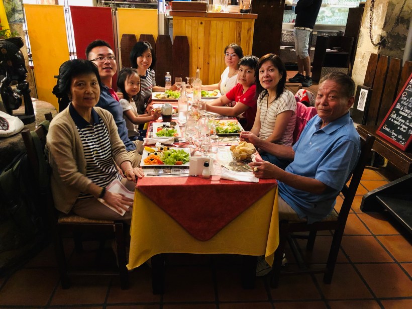 下山回城,在城裡的一間餐廳用餐,Chelsea 吃著到法國迷上的炸魚餐,Florence 則已精疲力盡地在嬰兒車裡睡覺。