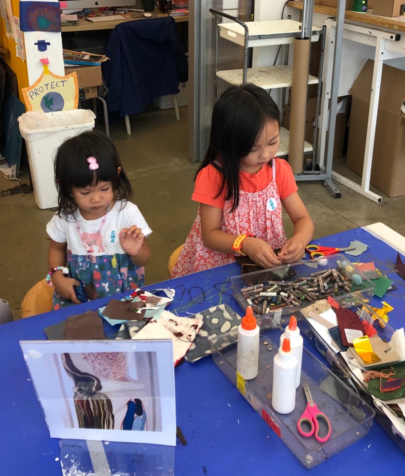 接著到美術創作室做勞作,今天的主題是在布上拼貼彩繪,並製作成書,姐妹倆專心地設計創作自己的作品。