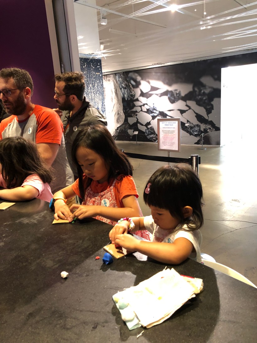 美術館裡有提供免費課程,姐妹倆報名了一節黏土課,老師要大家在紙板上用黏土搭造小橋流水與庭園佈景,Chelsea 跟 Florence 認真地捏黏土在紙板上製作橋、河流、草地、石頭與小樹。