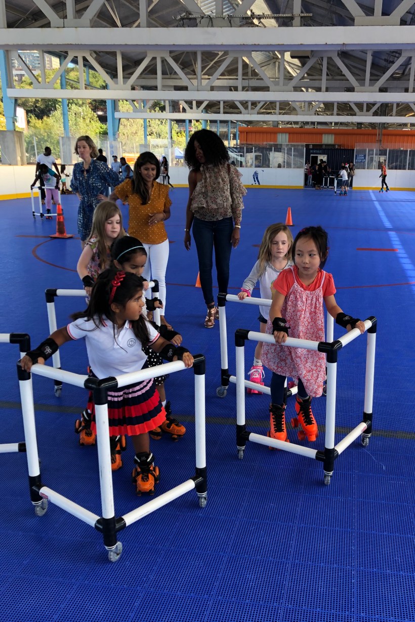 週日,Chelsea 同學 Scarlet 在布魯克林河濱公園的溜冰場舉行生日派對,邀請同學們一起體驗滑輪,大夥新奇地帶著輔助器練習。