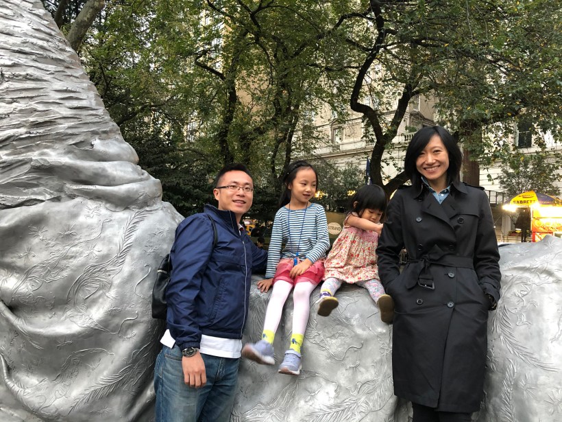 我們在公園裡散步,在出口附近看到了大型恐龍裝置藝術,姐妹們興奮地爬到恐龍的背上,我們全家一起合影留念。
