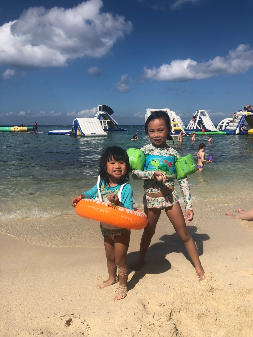 第二個停靠站來到了墨西哥的 Costal Maya Port,由於是個小港口,我們留在船上玩。第三站抵達墨西哥的 Cozumel 島,這裡的海灘有提供各種氣墊滑梯,Chelsea 跟 Florence,很好奇地在一旁觀看,躍躍欲試。