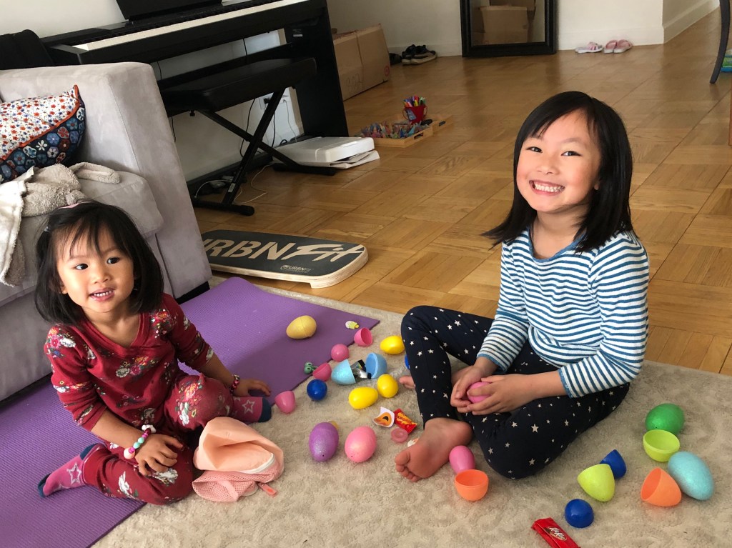 Chelsea & Florence Tsai – Happy Easter – April 2020 April 18, 2020 by pinghantsai Leave a comment 這週是復活節長週末,復活節是小孩子最愛的節日之一,往常公園會舉辦撿彩蛋的活動,彩蛋中通常裝著兔子形狀的巧克力或糖果。今年因為居家隔離,大家只好自己在家裡過節,Chelsea 與 Florence 很用心地在家製作復活節兔子裝飾。 至於最受歡迎的撿彩蛋活動,我們也在家裡藏了許多裝著糖果的彩蛋給兩姐妹來找,經過了一陣努力搜索,姐妹倆開心地展示所有戰利品。 Share this: Click to share on X (Opens in new window) X Click to share on Facebook (Opens in new window) Facebook Like Loading... Related