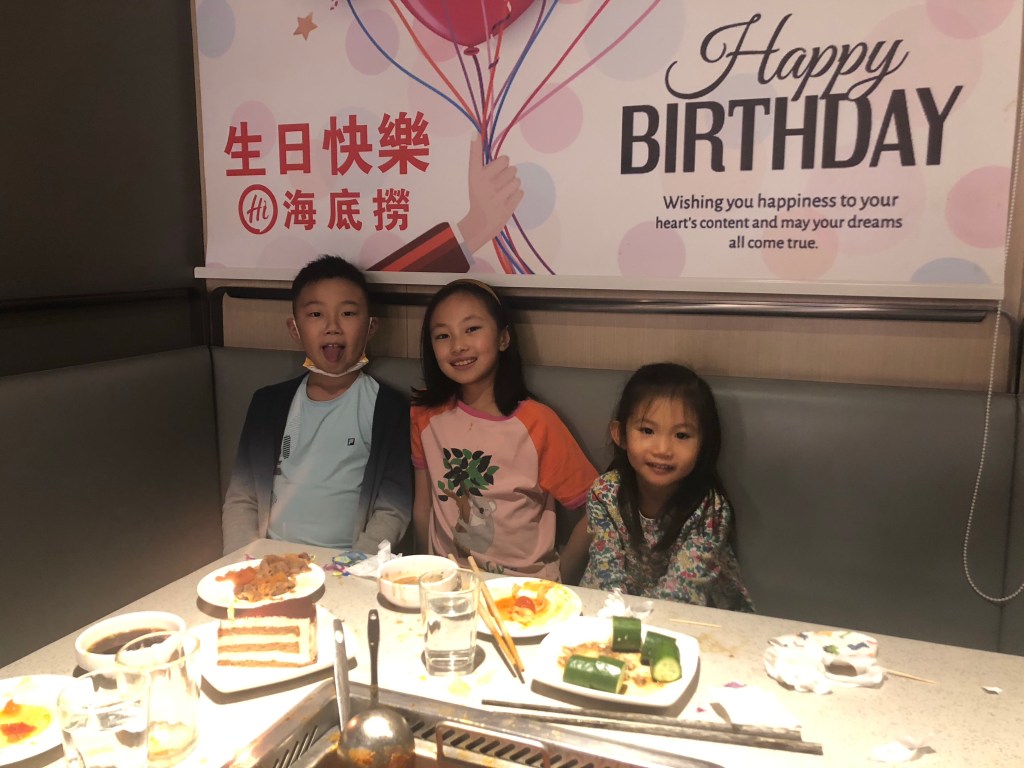 鄰居好朋友-大寶一家也幫 Chelsea 在銅鑼灣的海底撈餐廳慶生,Chelsea, Florence 跟大寶三人開心地涮肉吃菜,飯後餐廳工作人員還送上小蛋糕,合唱生日歌,Chelsea 開心地度過九歲生日。
