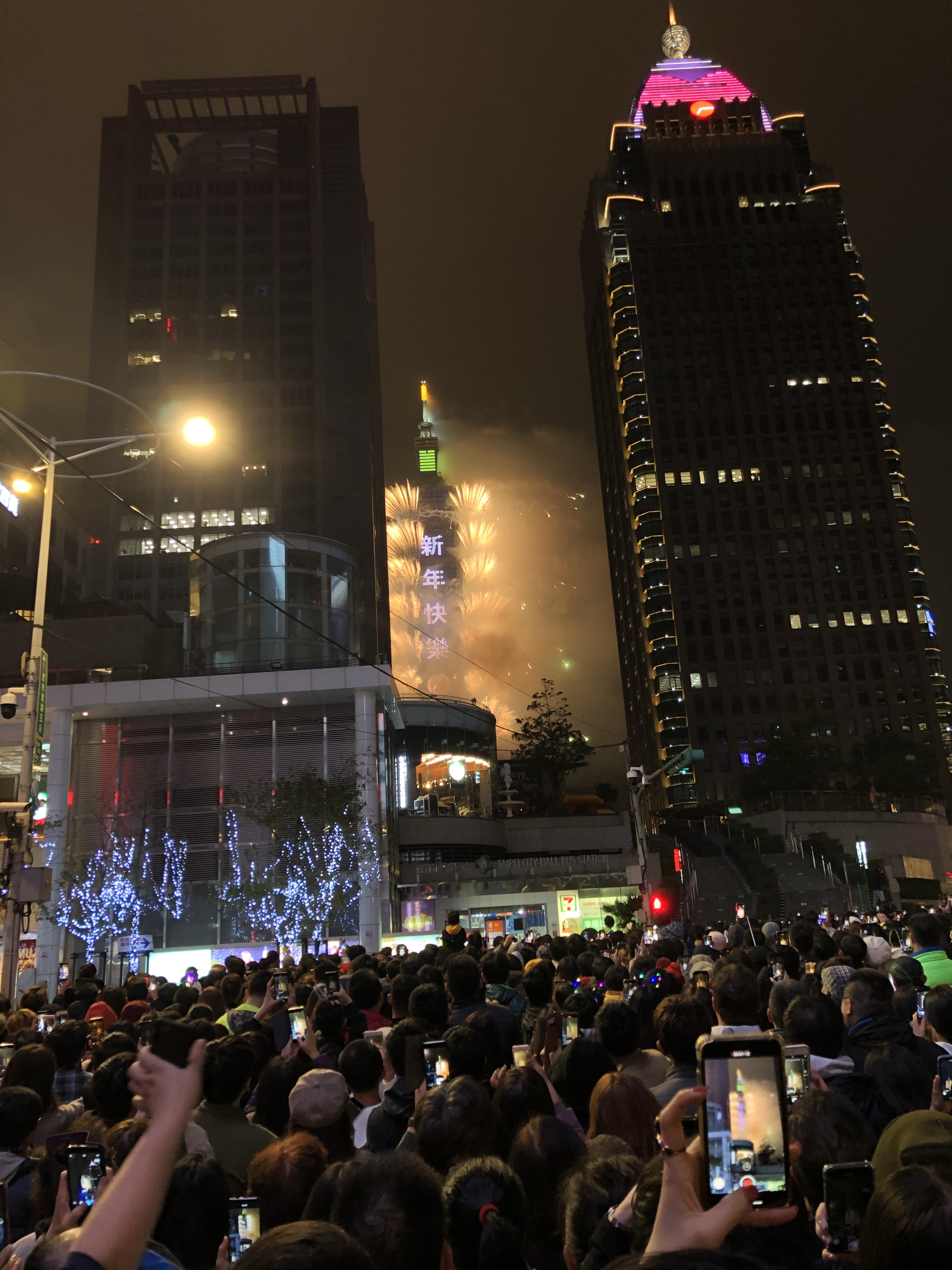 我們也在最後一刻擠進台北市政府廣場,欣賞台北101 大樓的一年一度煙火表演,並聽了一段跨年演唱會,歌手蘇打綠樂團的青峰在台上述說著他一隔十年又在台灣跨年的心境,回想自己在 2009年去美國留學、畢業工作、結婚生子,此刻一家四口回台灣跨年,一轉眼也已十年歲月。