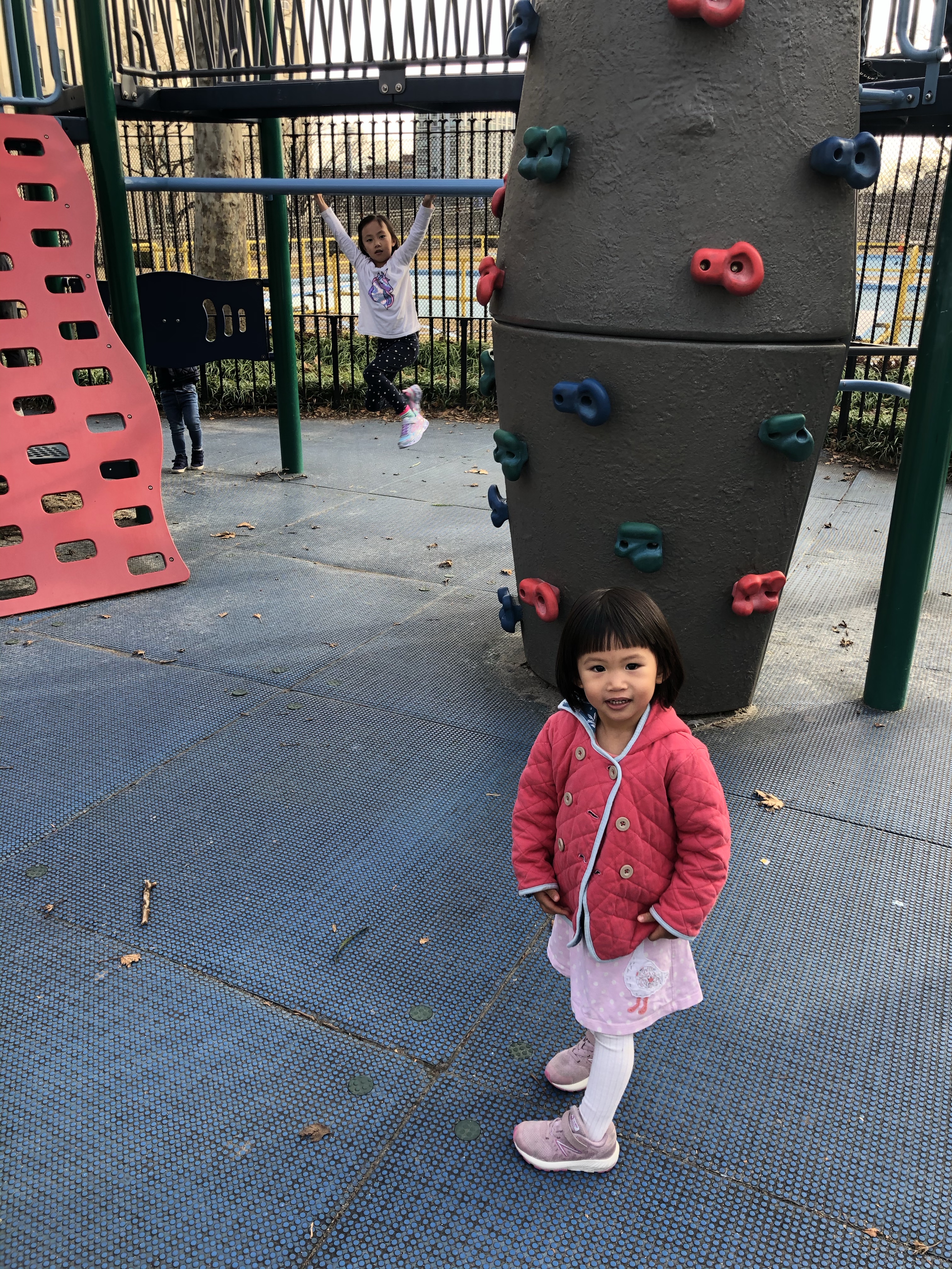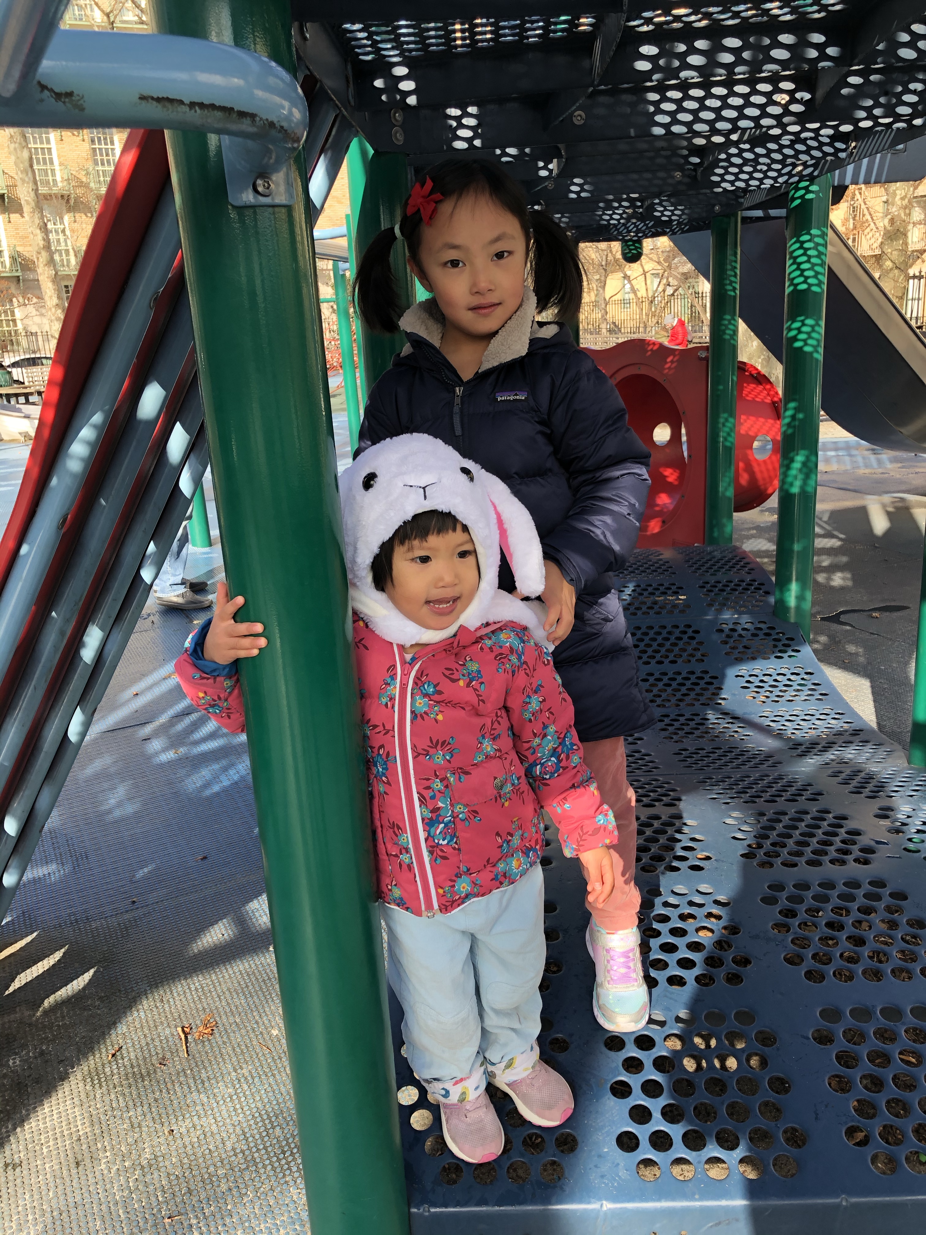 Florence 還有時差,白天大多在家裡休息,下午天氣晴朗,姐妹倆一起到新家旁邊的 John Jay 公園玩,這個東河畔的公園,有許多兒童遊樂器材,也有籃球、網球與游泳池,是個運動休憩的好地方。