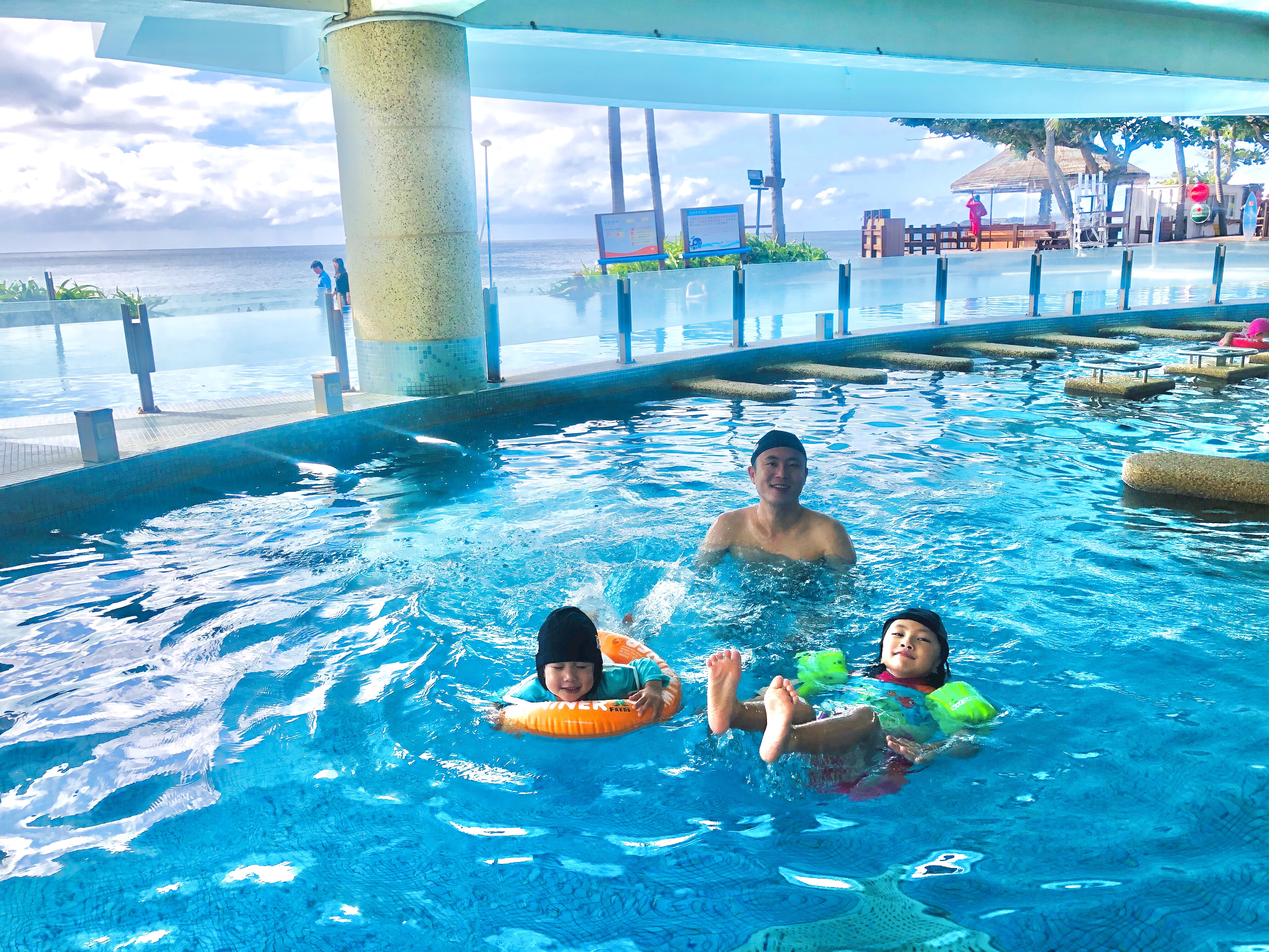 姐妹倆也喜歡泡在飯店的泳池裡玩水、游泳。